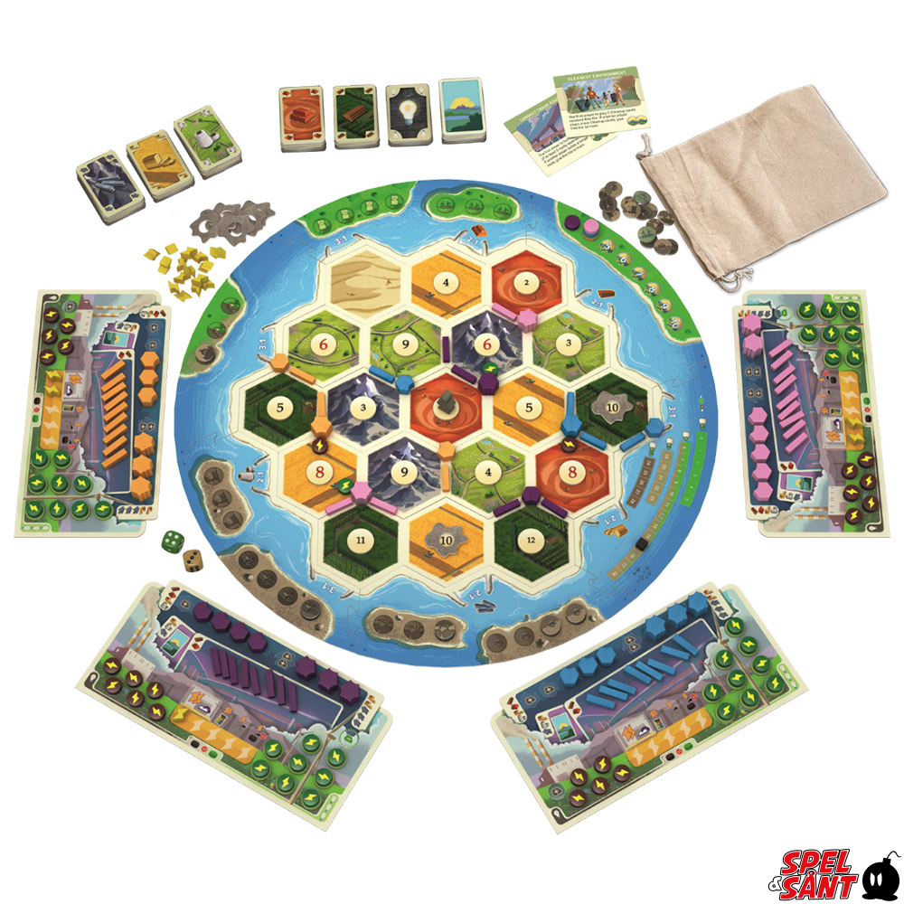 Catan: Ny Energi är ett nytt, fristående spel som bygger på klassiska CATAN-mekanismer som skörd, handel och byggande. Nya spelelement som kraftverk, energipoletter och miljöevenemang tillför nya strategier och berättelser till en välbekant grund.