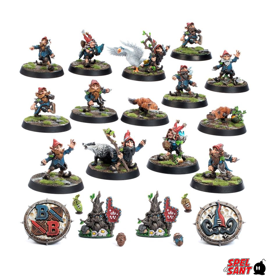 This multipart plastic kit builds the Glimdwarrow Groundhogs, a Gnome team for use in games of Blood Bowl. The team comprises eight Gnome Linemen, two Woodland Foxes, two Gnome Illusionists, and two Gnome Beastmasters. You'll find four head options that can be used with any of the four different Lineman bodies, as well as two alternative heads for each of the other positions. The Beastmasters have a choice of staff toppers, as well as either goose or badger friends. In addition, there are two double-sided Blood Bowl coins, two turn and re-roll markers, four balls, and a transfer sheet.