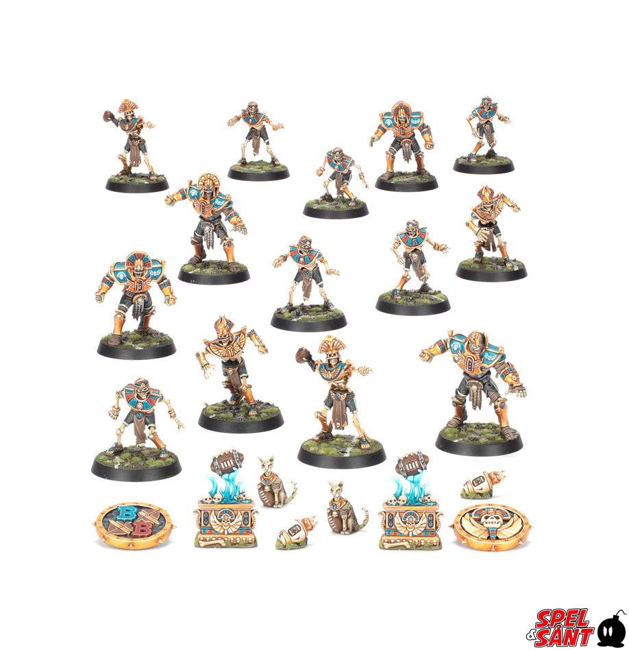 - 14 Bone-coloured plastic Tomb Kings players: 2x Tomb Kings Blitzers, 2x Tomb Kings Throwers, 4x Tomb Guardians, 6x Skeleton Linemen, plus coins, Re-roll markers, and extra balls