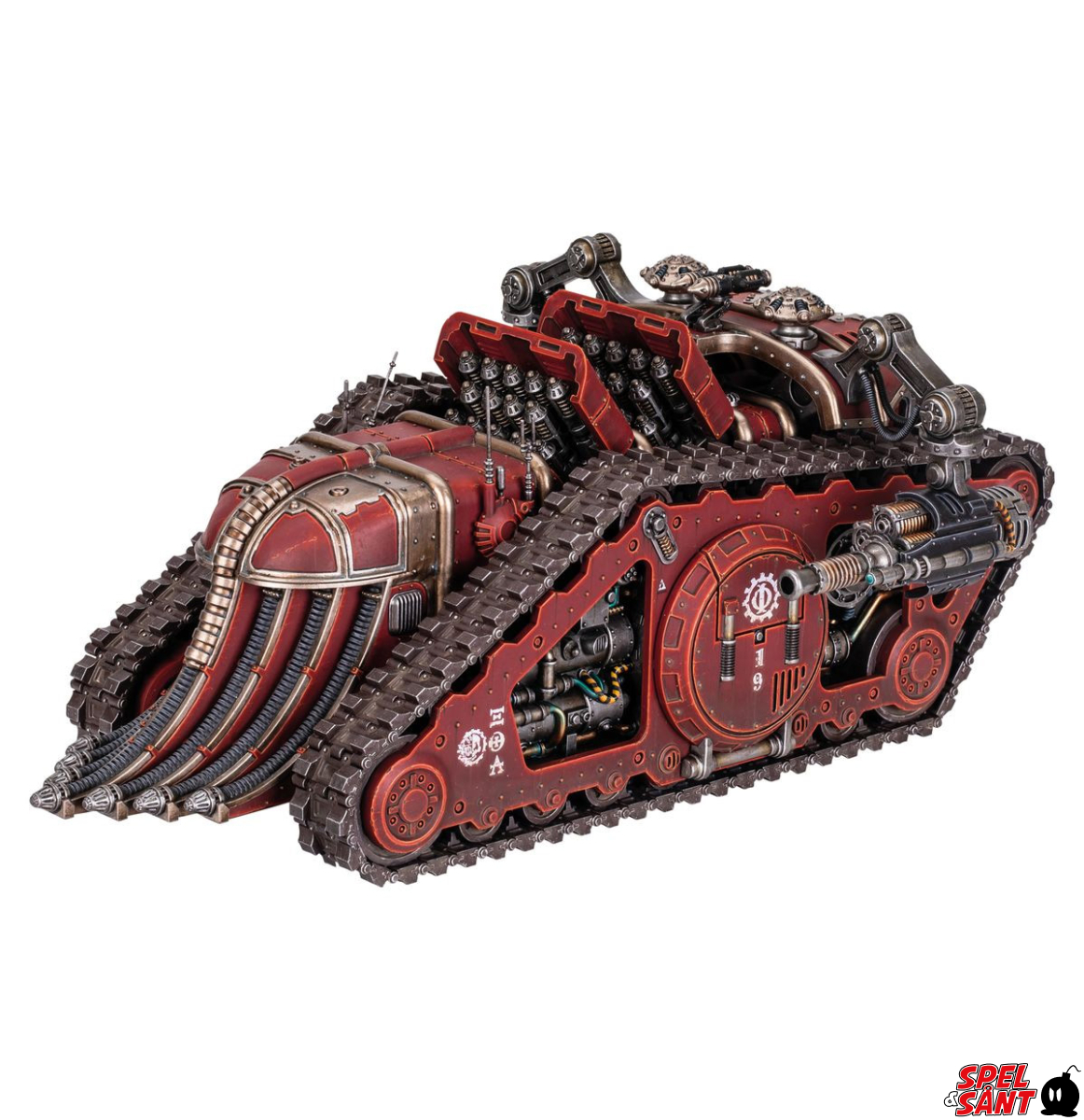 The Karacnos is a dedicated assault tank, based on the Triaros Armoured Conveyor chassis, but with the transport compartment replaced with a mortar battery of Karacnos radiological warheads. These volatile warheads are designed to sweep an area clear of organic life for later acquisition by the forces of the Machine God.