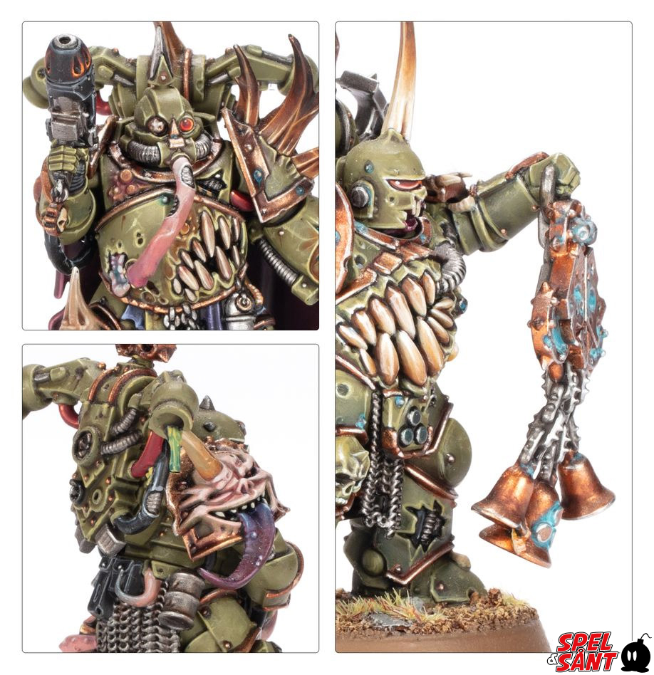 Sholgor the Putrid is a Lord of Virulence who leads his shambling Death Guard warband to battle surrounded by a bodyguard of Deathshroud Terminators, advancing implacably as his bloated Plague Marine forces unleash withering hails of firepower, supported by their corrupted Rhino. All the while Septimol Fulg, the Tallyman, makes note of their harvest.