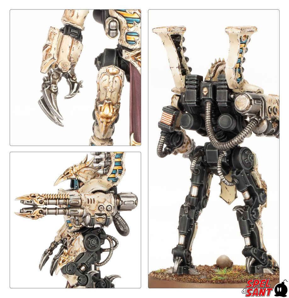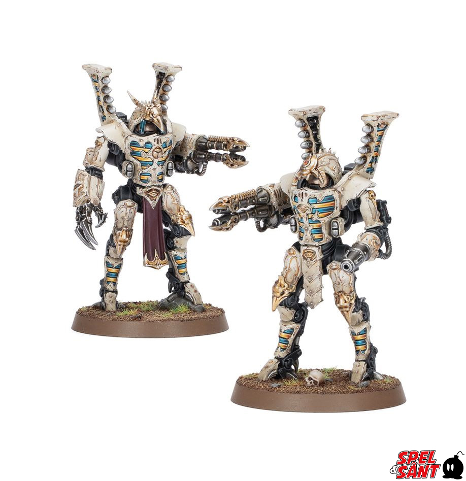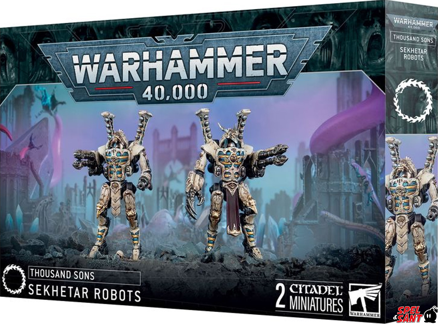 This multipart plastic kit builds two Sekhetar Robots, powerful battle automata for your Thousand Sons armies in games of Warhammer 40,000. These looming mechanical constructs are equipped with heavy warpflamers and hellfyre missile racks. They are also both armed with a pyreflux meltagun, which can optionally be replaced with a warpflame projector and power claw. They are ideal for guarding key objectives, easily keeping enemy warriors away with their lethal firepower.