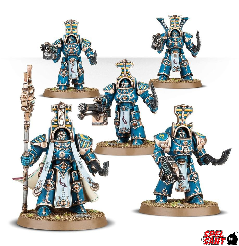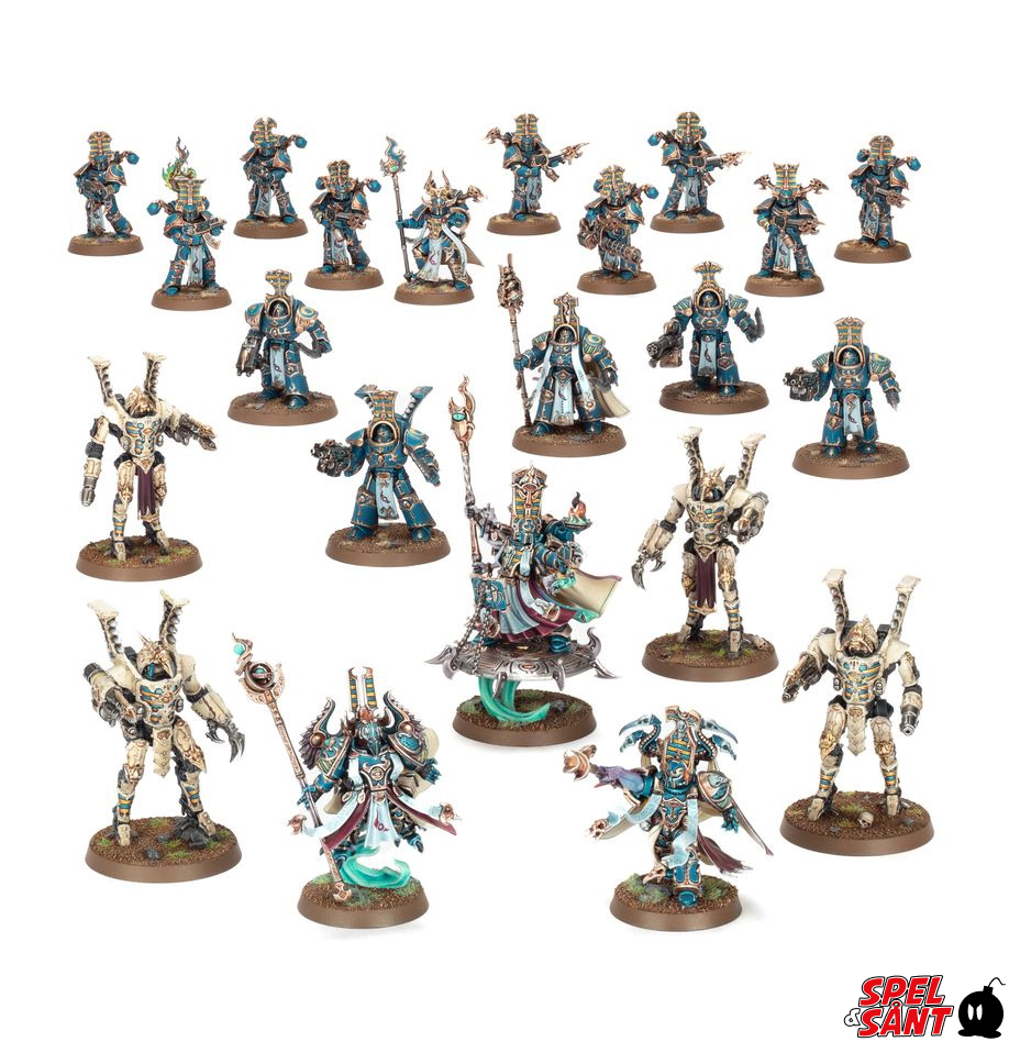 This stuffed box contains a Thousand Sons force for use in games of Warhammer 40,000. Led by three Exalted Sorcerers and supported by Sekhetar Robots and Scarab Occult Terminators, they perform well in the hands of a savvy general. A unit of Rubric Marines round out the ensemble, offering objective-grabbing potential and adding to the firepower of the force with heavy and special weapons.