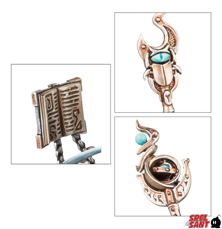 The Scarab Occult Terminators are each armed with an inferno combi-bolter and a Prosperine khopesh. One miniature can be given a heavy warpflamer, soulreaper cannon, or hellfyre missile rack. The staff-wielding Scarab Occult Sorcerer can be armed with either an inferno combi-bolter or a Prosperine khopesh.