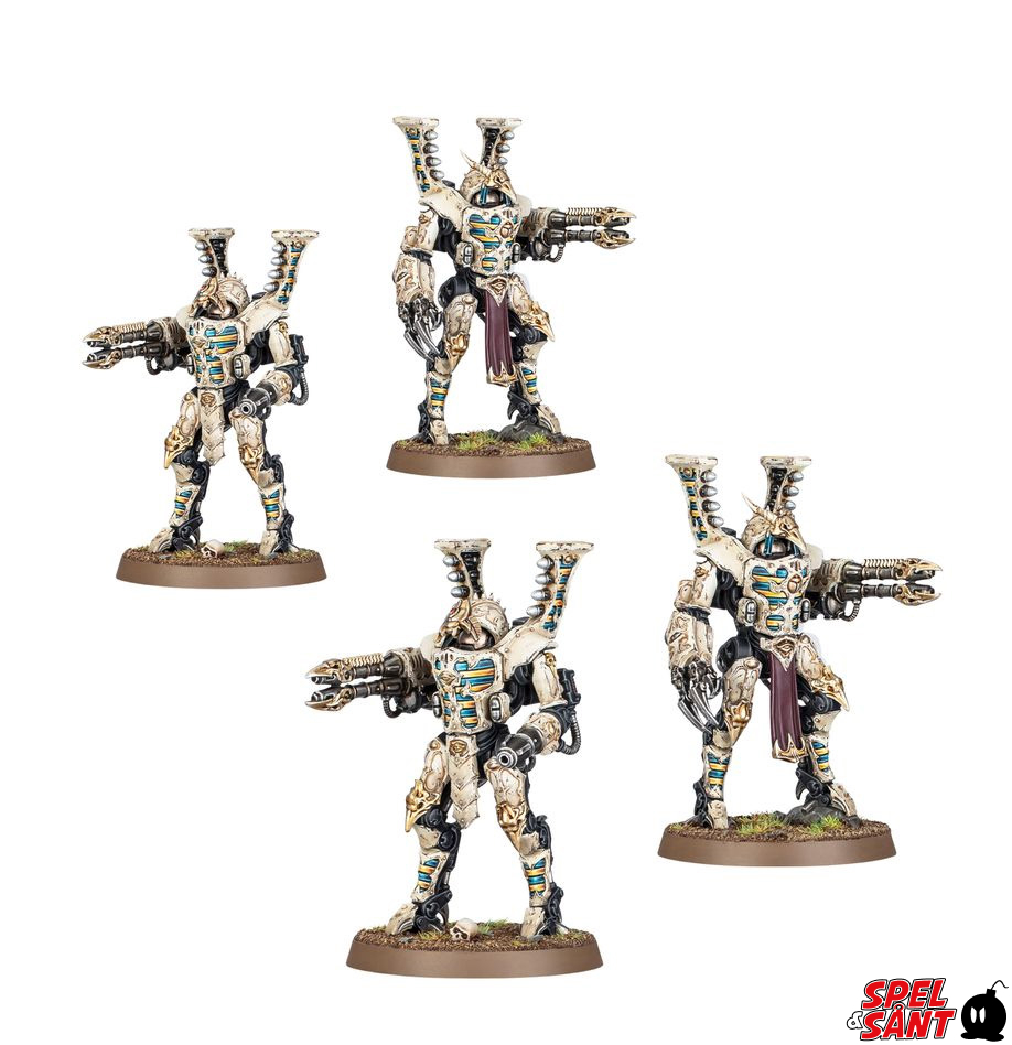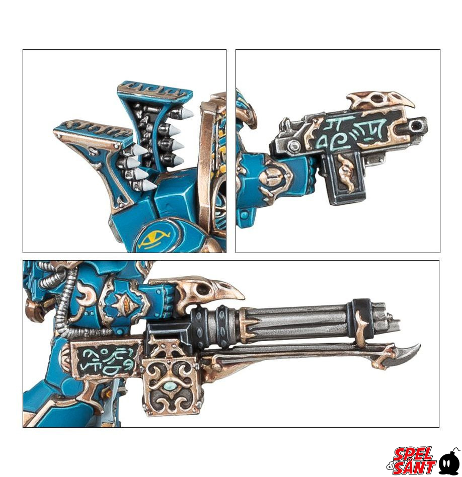 The Sekhetar Robots are armed with heavy warpflamers, hellfyre missile racks, and pyreflux meltaguns. The pyreflux meltagun can alternatively be traded out for a warpflame projector and a cruel power claw.