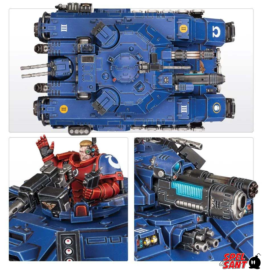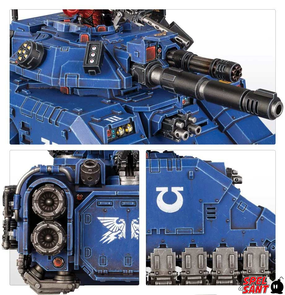 The Repulsor Executioner is the most heavily armed battle tank available to the Adeptus Astartes, with a choice of murderously powerful, primary turret-mounted weapon – a macro plasma incinerator or heavy laser destructor – supported by a coaxial heavy onslaught gatling cannon. Add to that two krakstorm grenade launchers, two storm bolters, a twin Icarus ironhail heavy stubber, an ironhail heavy stubber as well as a hull-mounted twin heavy bolter and your Repulsor Executioner certainly won’t be lacking for firepower! You can supplement this offensive capability with a set of defensive auto launchers and even an Icarus rocket pod for further aerial protection.
