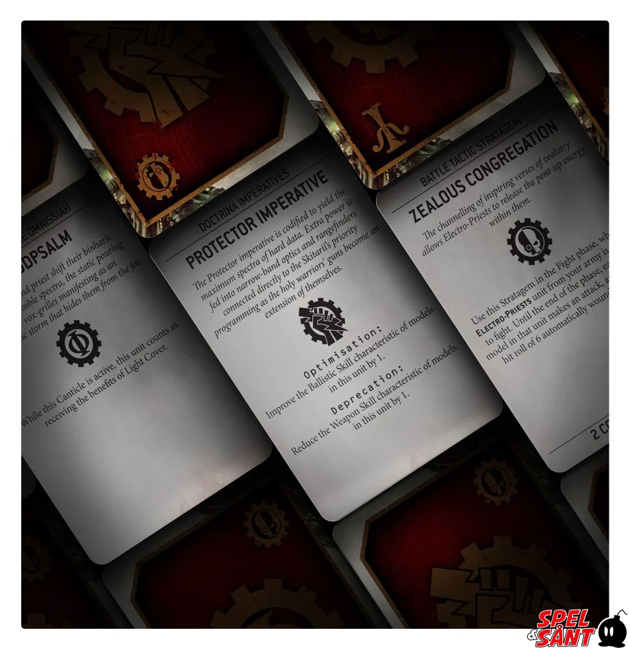 You will need a copy of the Warhammer 40,000 Core Book and Codex: Adeptus Mechanicus to make full use of these cards.