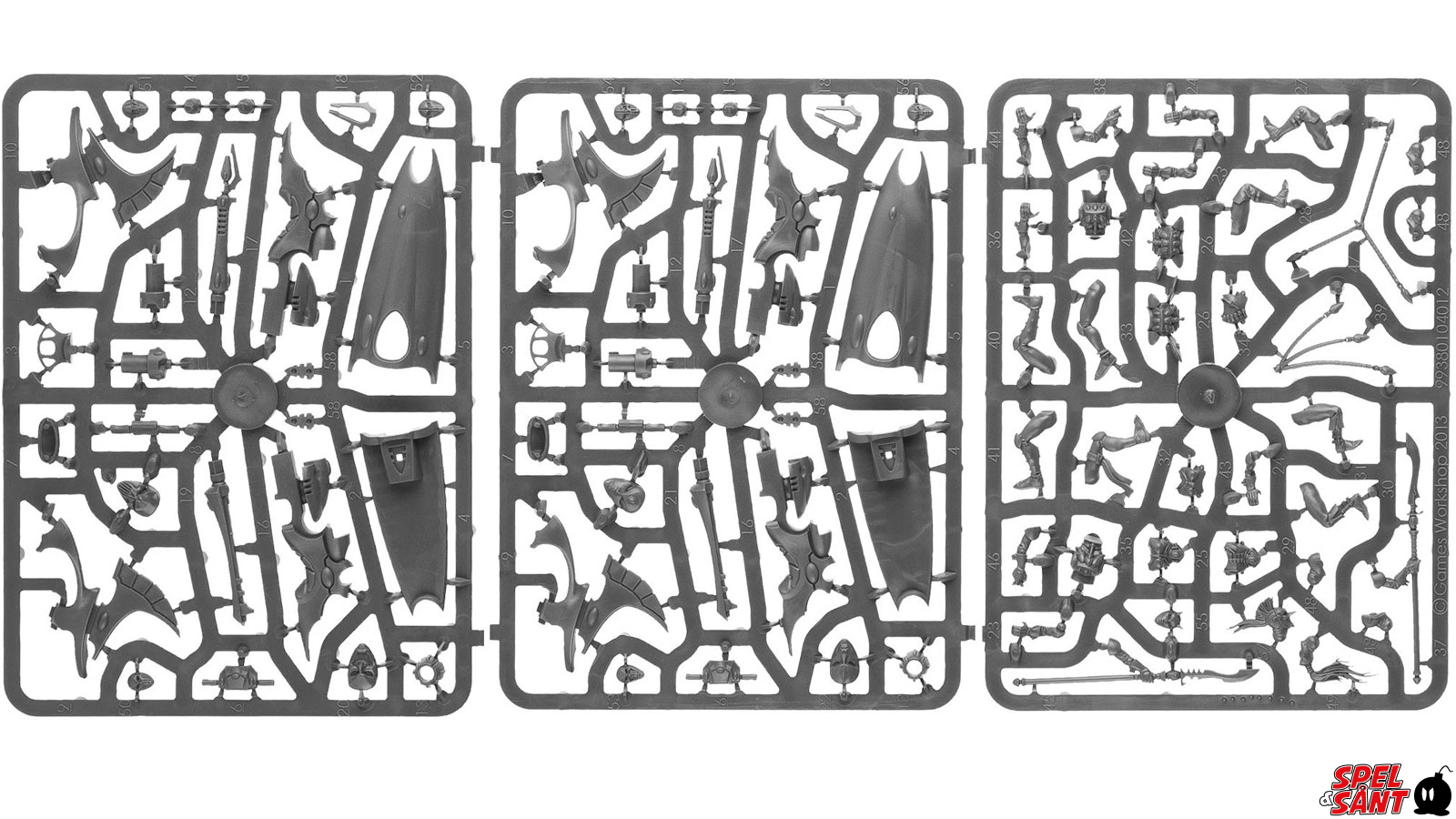 This box contains everything you need to make 2 Harlequin Skyweavers, each with a pilot and pillion rider. Each Skyweaver is armed with a shuriken cannon and mirage launcher, the shuriken cannon can be replaced with a haywire cannon. The pillion riders can each be armed with either star bolas or a zephyrglaive, and there are five heads with space to add one of 7 individually designed masks for both the pilots and pillion riders, as well as one completely masked head.