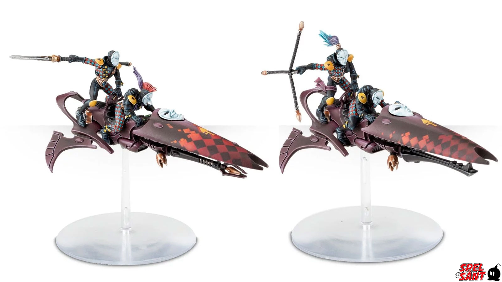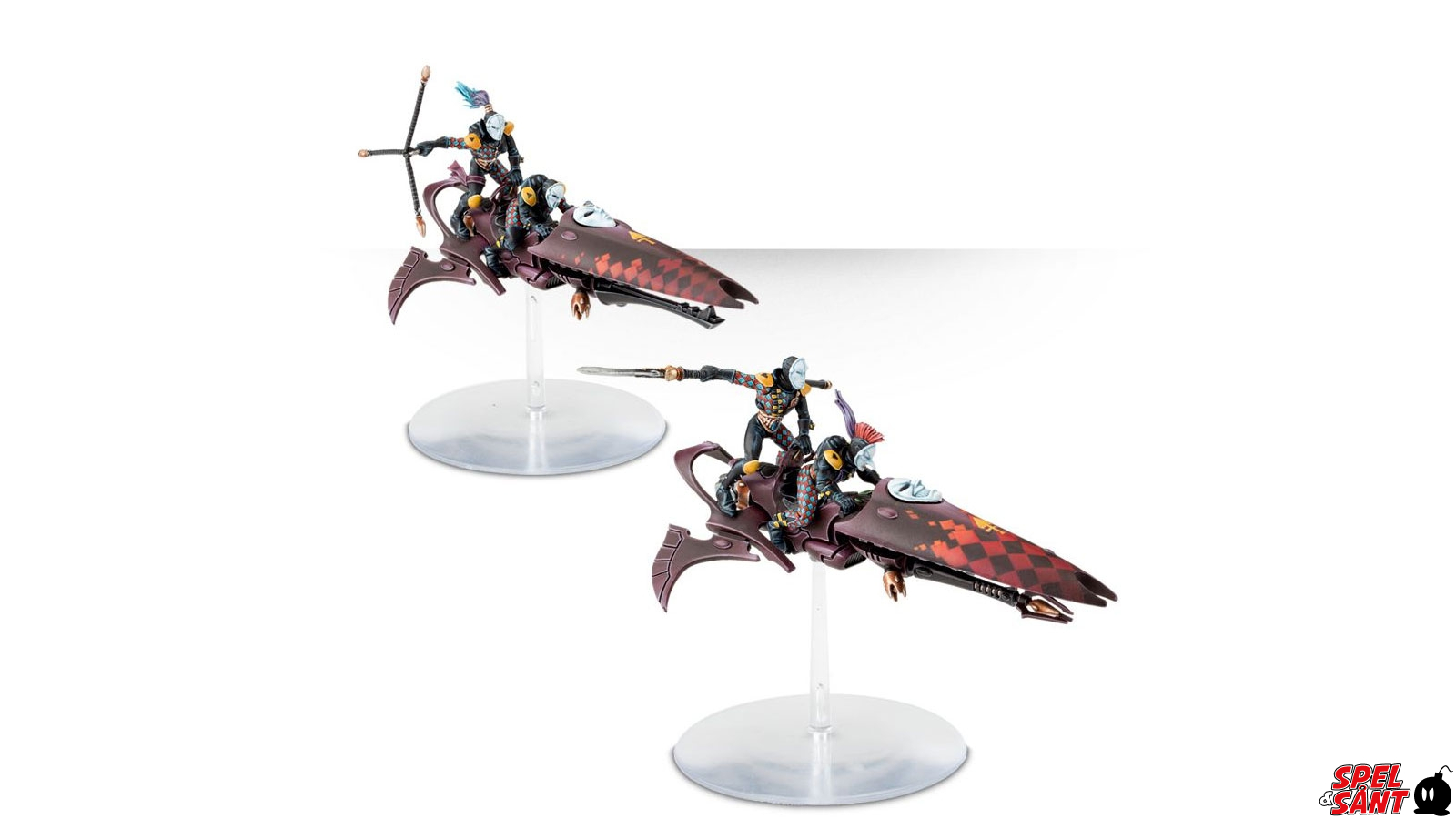 This multi-part plastic kit contains 84 components with which to make a 2 Harlequin Skyweavers. Also included are 2 large flying bases and a Harlequins transfer sheet.