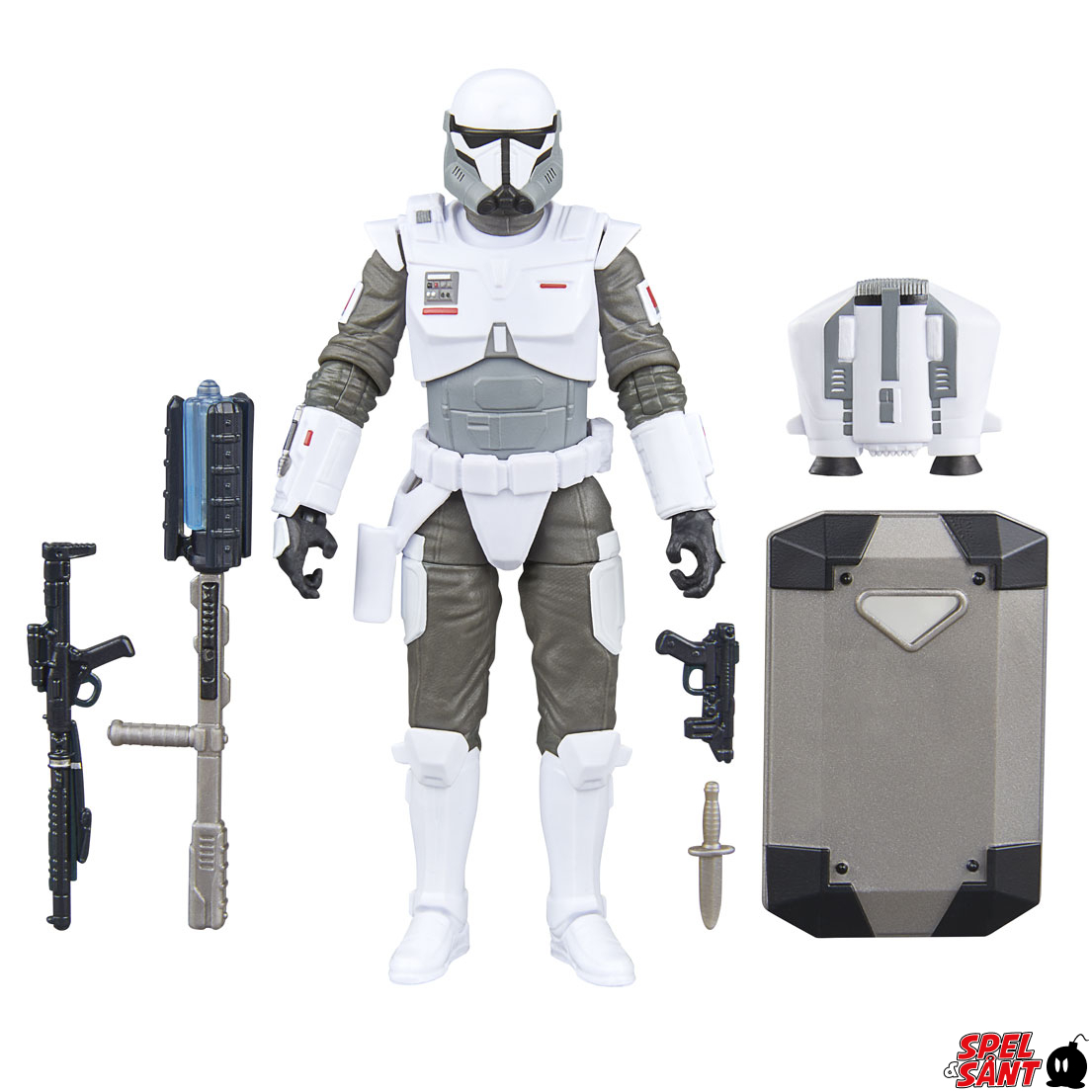 This Imperial Armored Commando figure comes with 5 accessories, including a riot shield, dagger, long and short blasters, and a baton