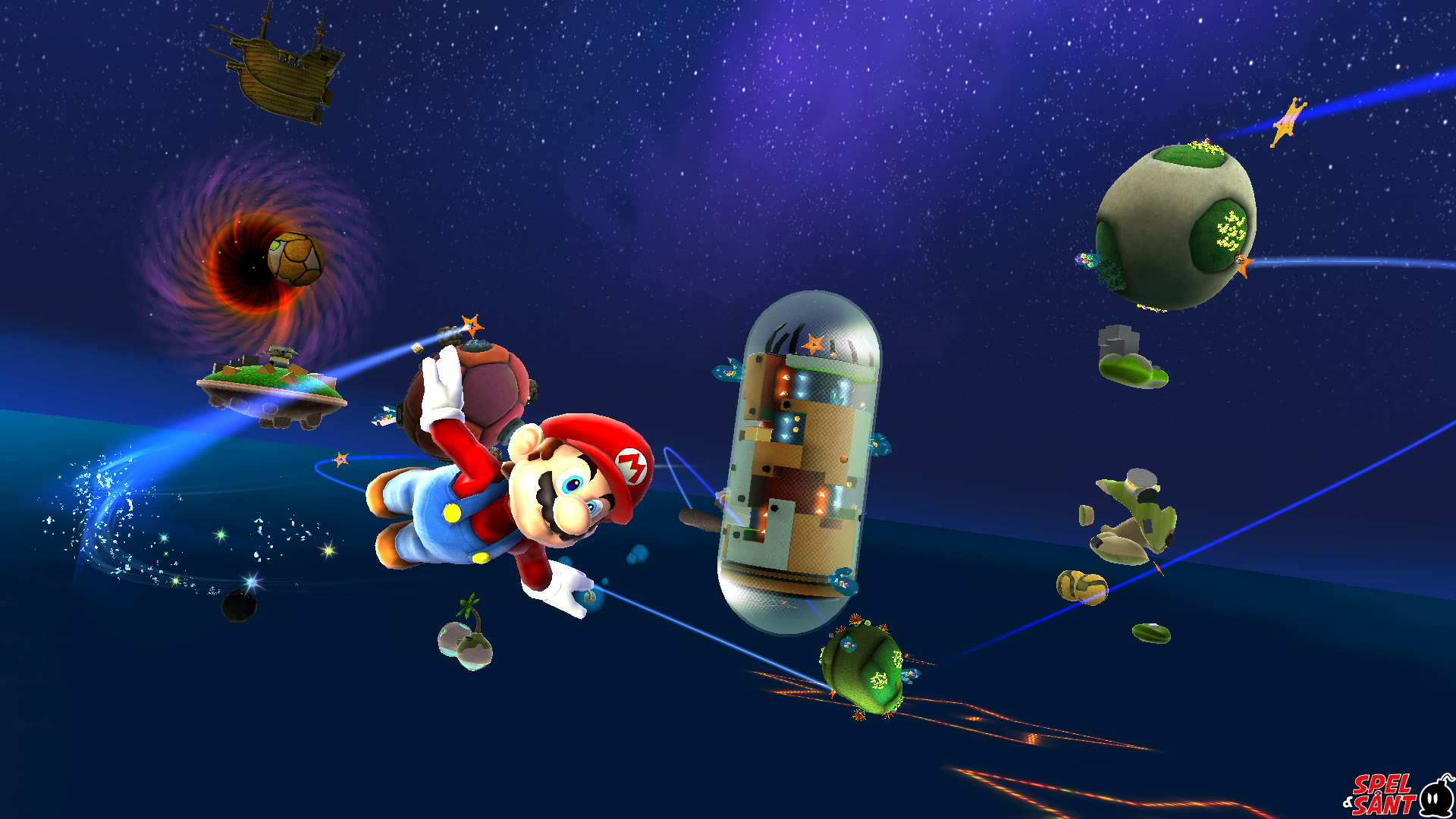 Är det där rymdskeppet format som... Marios huvud?! Det är det verkligen! Res runt bland stjärnorna med Lubba och hennes besättning av rymdfarande Lumas, och besök en mängd olika galaxer. Var och en erbjuder sina egna unika utmaningar att övervinna, och massor av Power Stars att återta!