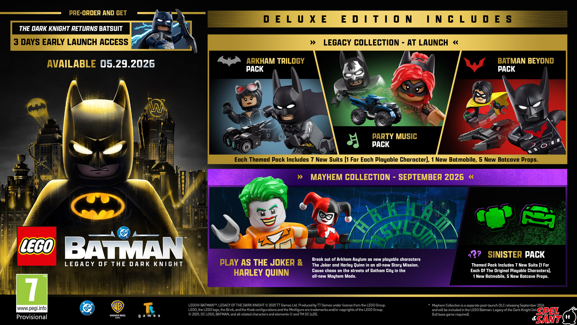 *Mayhem Collection is a separate post-launch DLC releasing September 2026 and will be included in the LEGO Batman: Legacy of the Dark Knight Deluxe Edition (full base game required).
