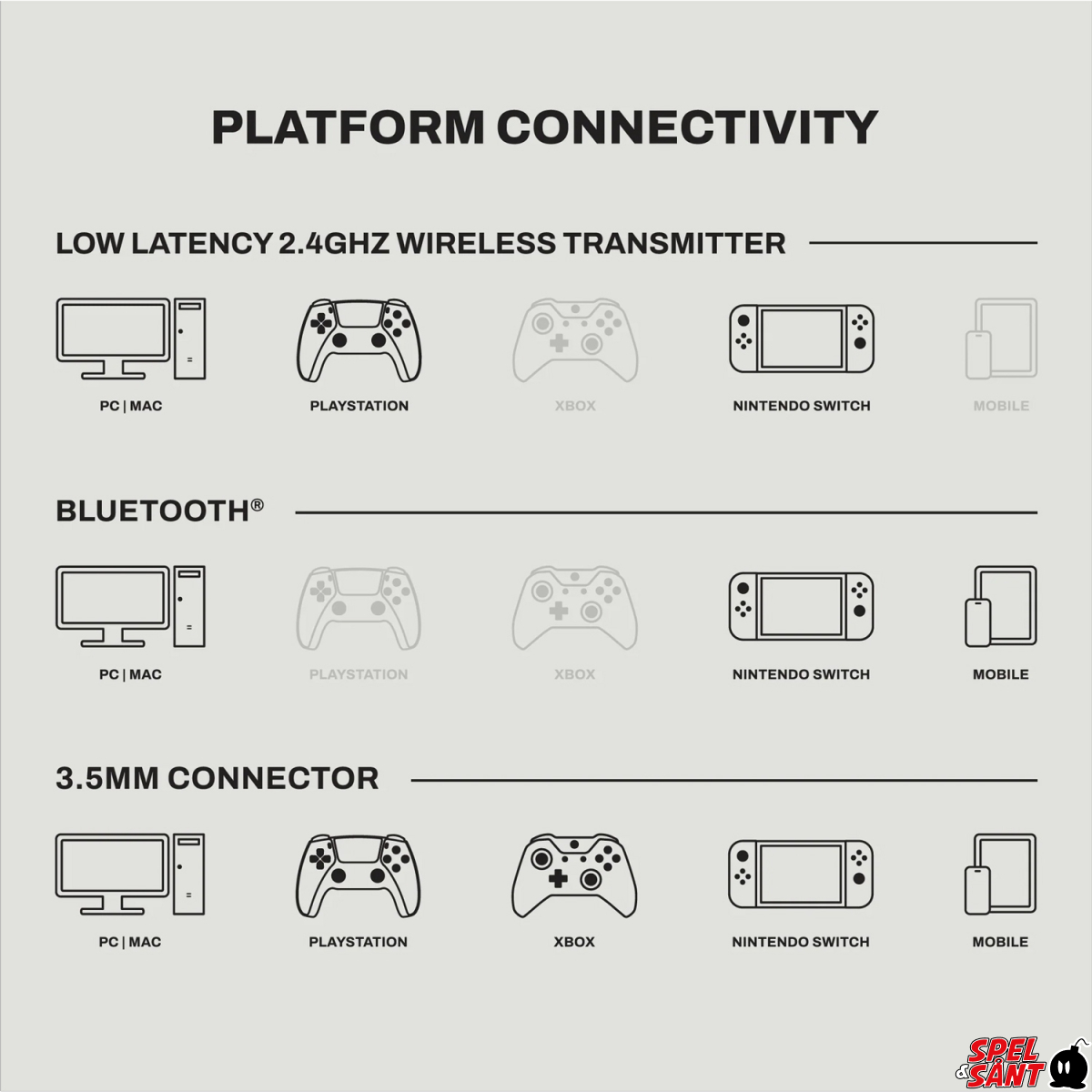 Med Skull-HQ-programvaran, som finns tillgänglig på både dator och mobil, kan du anpassa dina ljudinställningar, inklusive en 10-bands EQ, spel-/chattmix och spatiala inställningar. Headsetet har också en enkelriktad, avtagbar bommikrofon med Clear Voice Smart Mic-teknik, vilket säkerställer tydlig kommunikation under spel.