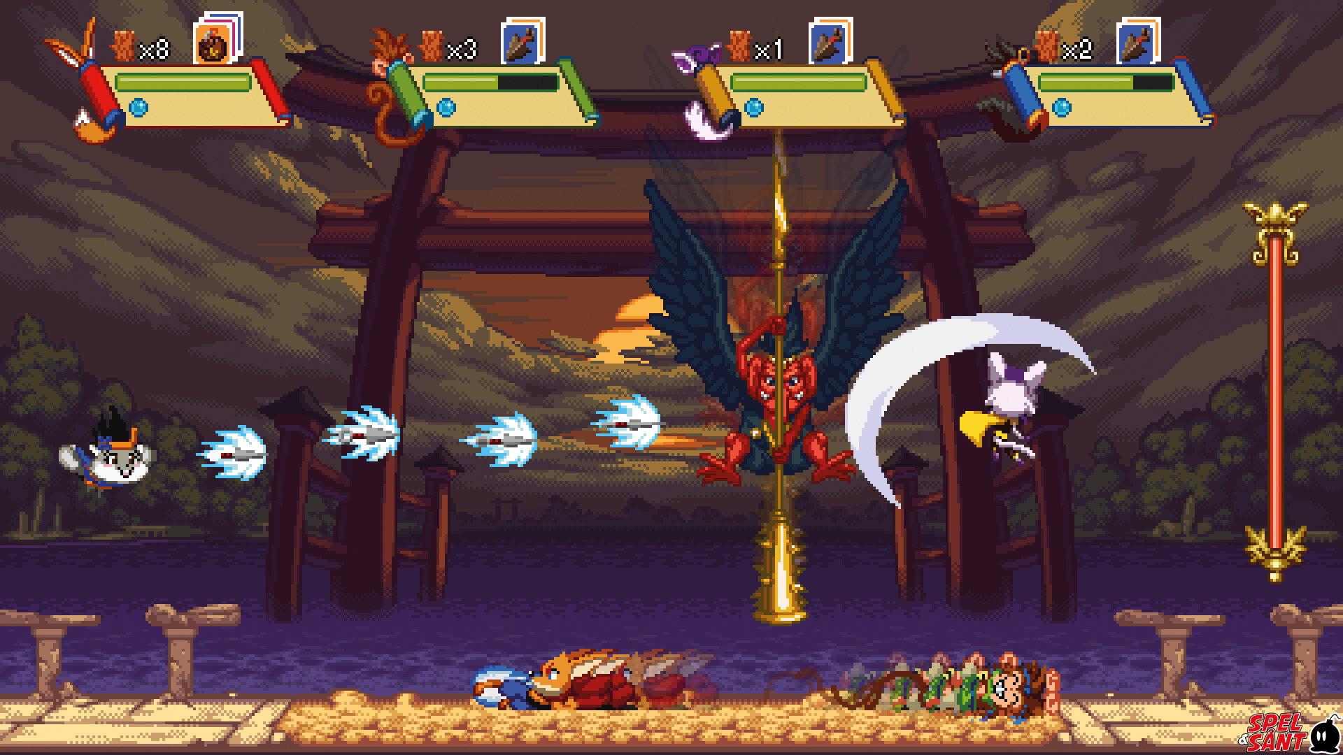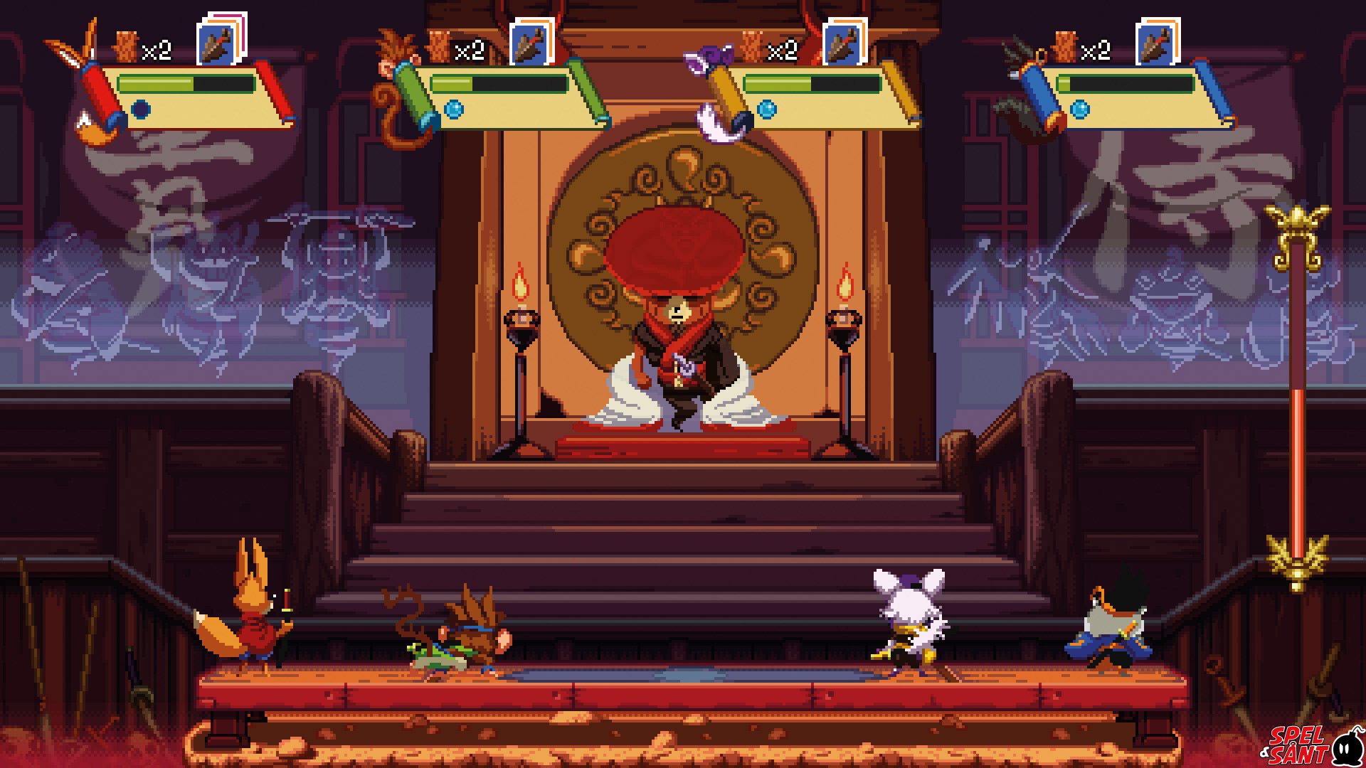 Kemono Heroes combines elements of run and gun, fast arcade action with dashes and slashes, with cool and fluffy characters. It can be experienced alone, choosing between 3 difficulties to enjoy a real challenge. Up to 4 friends can also join forces in cooperative mode, fighting and helping each other to overcome any obstacles in their way. After A Hole New World, an 8-bit like game, we thought we should make a 16-bit-like game now. An arcade cooperative one, for 4 players, with ninjas on it! Thus Kemono Heroes was born!