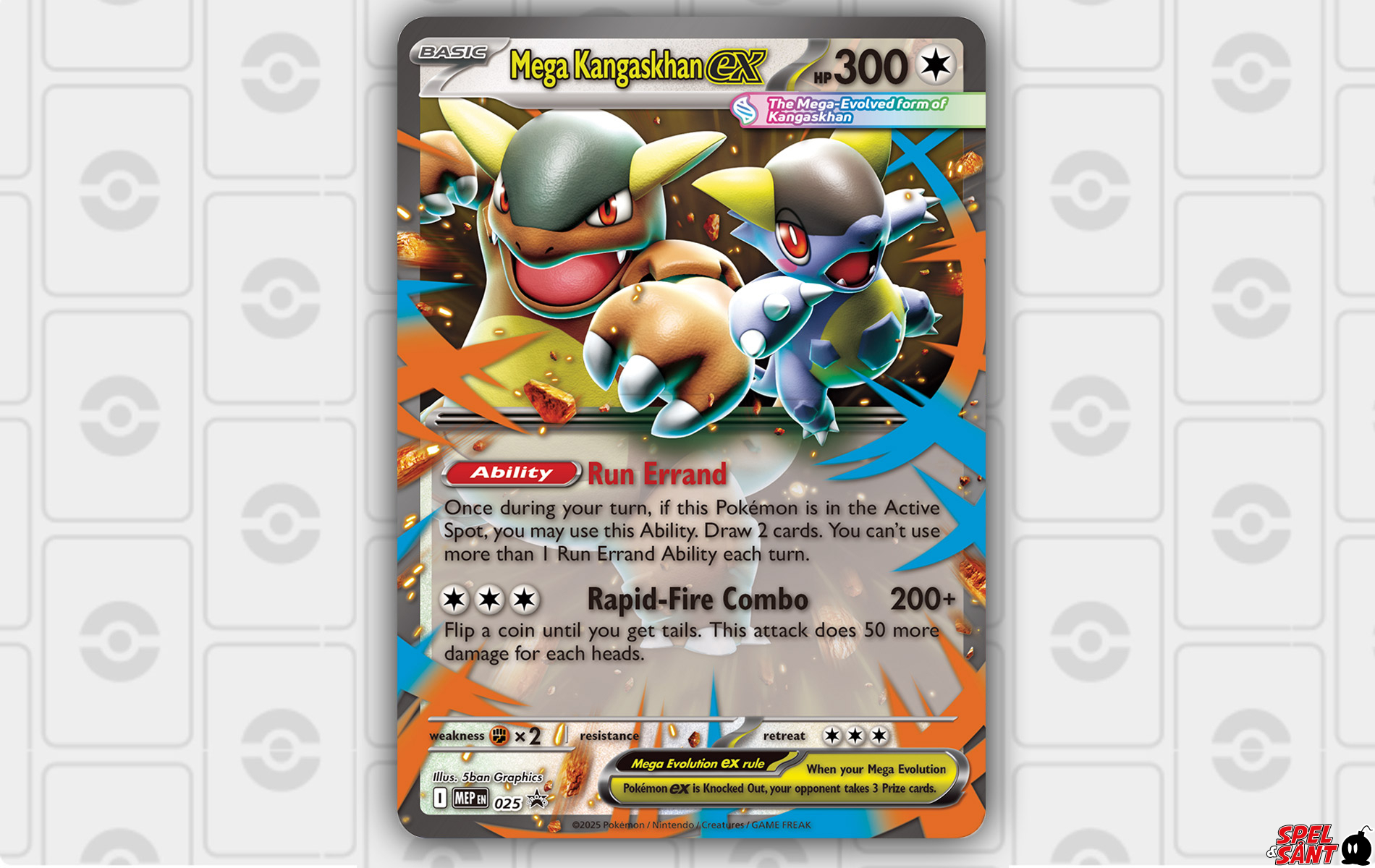 Mega Evolution makes Kangaskhan’s child a force to be reckoned with—and both of them combine their powers as Mega Kangaskhan ex! Draw extra cards with Run Errand, then use Rapid-Fire Combo and flip coins to seek bigger damage. Team up with Mega Kangaskhan ex as a playable foil promo card and an oversize lenticular version for display, then open four booster packs to find even more cool cards!