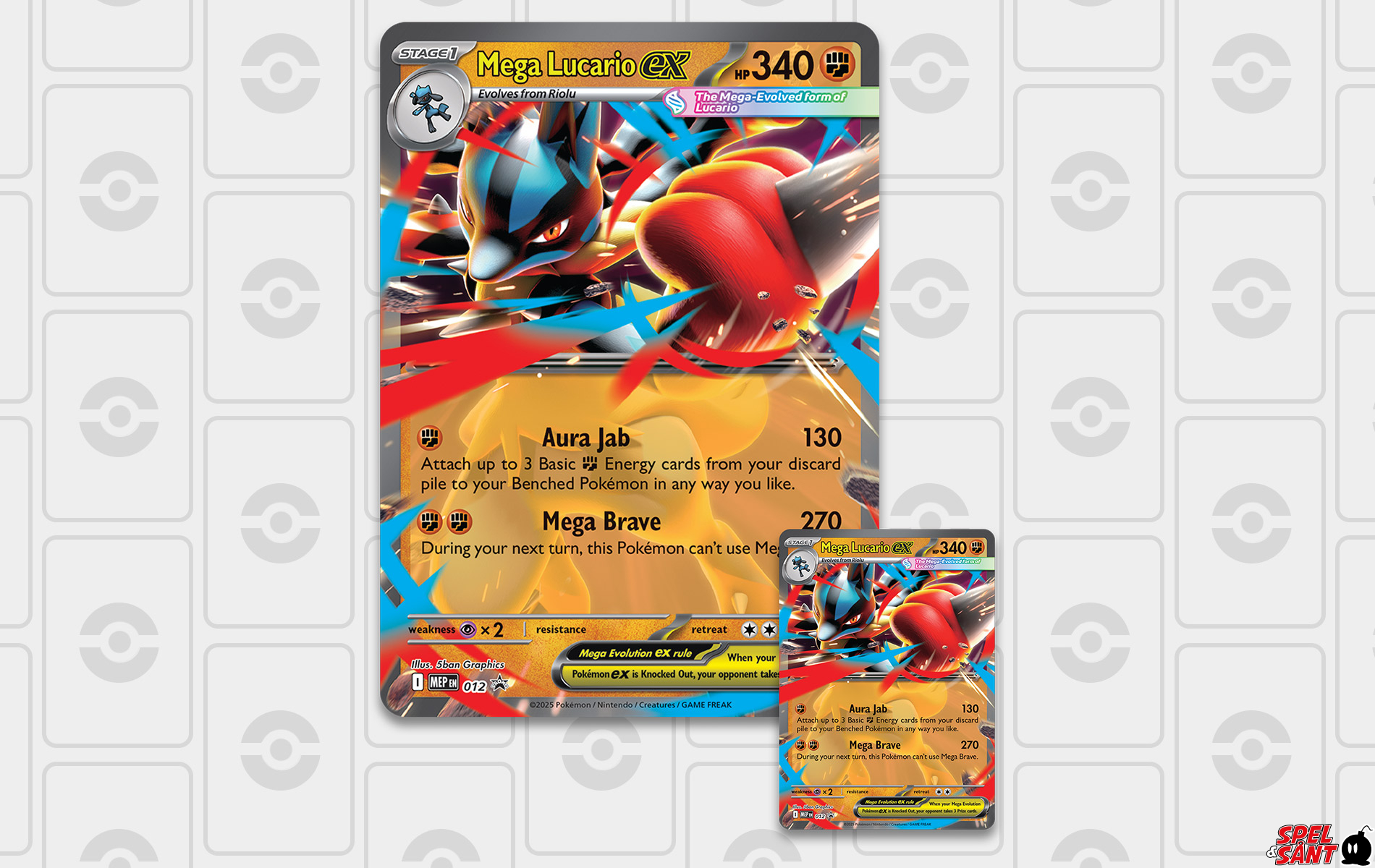 Showing no mercy, Mega Lucario ex pummels opponents while sharing discarded Energy with your Benched Pokémon! Bring this massive power to your own collection as a playable foil promo card paired with an oversize promo card and a detailed figure showing off Mega Lucario in action. You’ll find even more awesome Pokémon inside the stack of included booster packs.