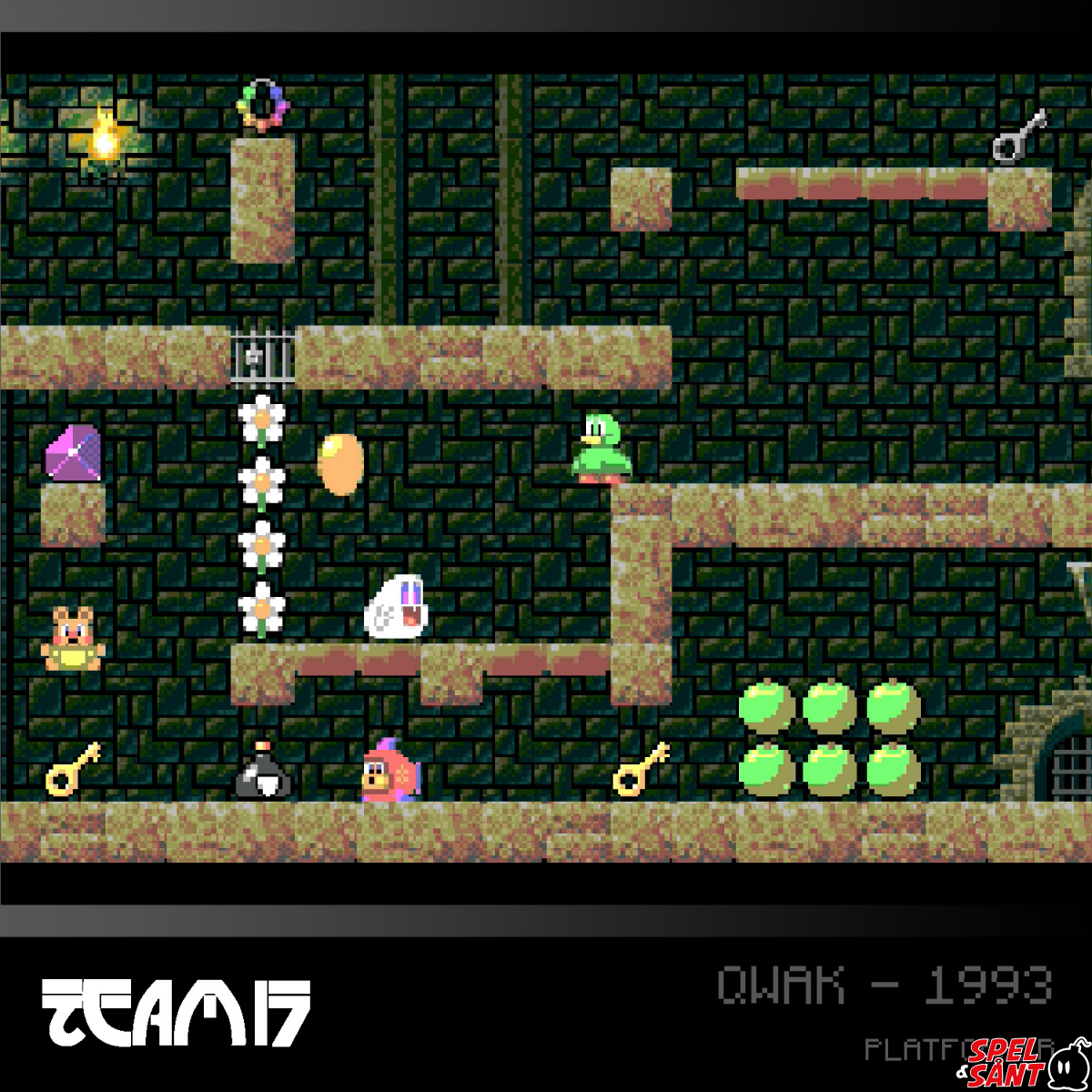 Team17's cartoony Amiga platformer Qwak bounces on to Evercade! Travel through eight worlds collecting keys, fruit, eggs and other treasure. Cooperate or compete with a friend in the simultaneous two-player mode!
