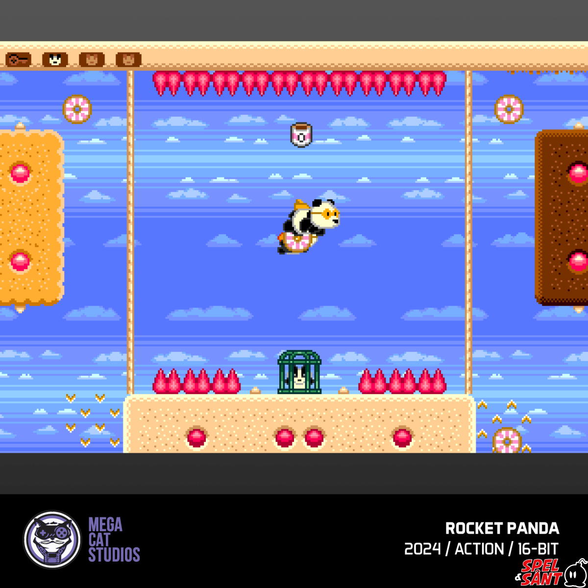 In this fun jetpack adventure for Evercade, assume the role of Rocket Panda as you guide him through a terrifyingly tasty world of dangerous mazes. Can you defeat the evil Biscuit Head?