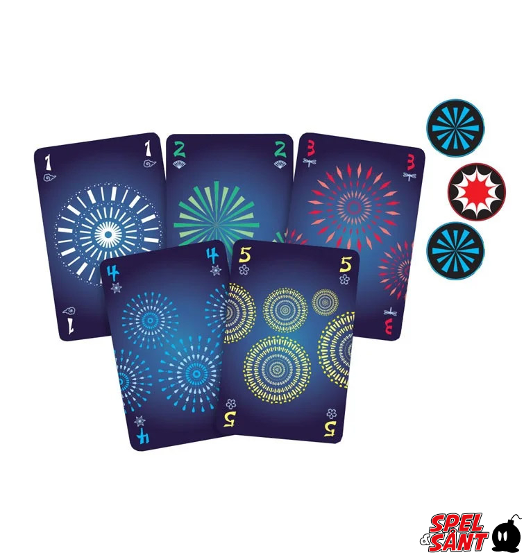 The card deck consists of five different colors of cards, numbered 1–5 in each color. For each color, the players try to place a row in the correct order from 1–5. Sounds easy, right? Well, not quite, as in this game you hold your cards so that they're visible only to other players. To assist other players in playing a card, you must give them hints regarding the numbers or the colors of their cards. Players must act as a team to avoid errors and to finish the fireworks display before they run out of cards.
