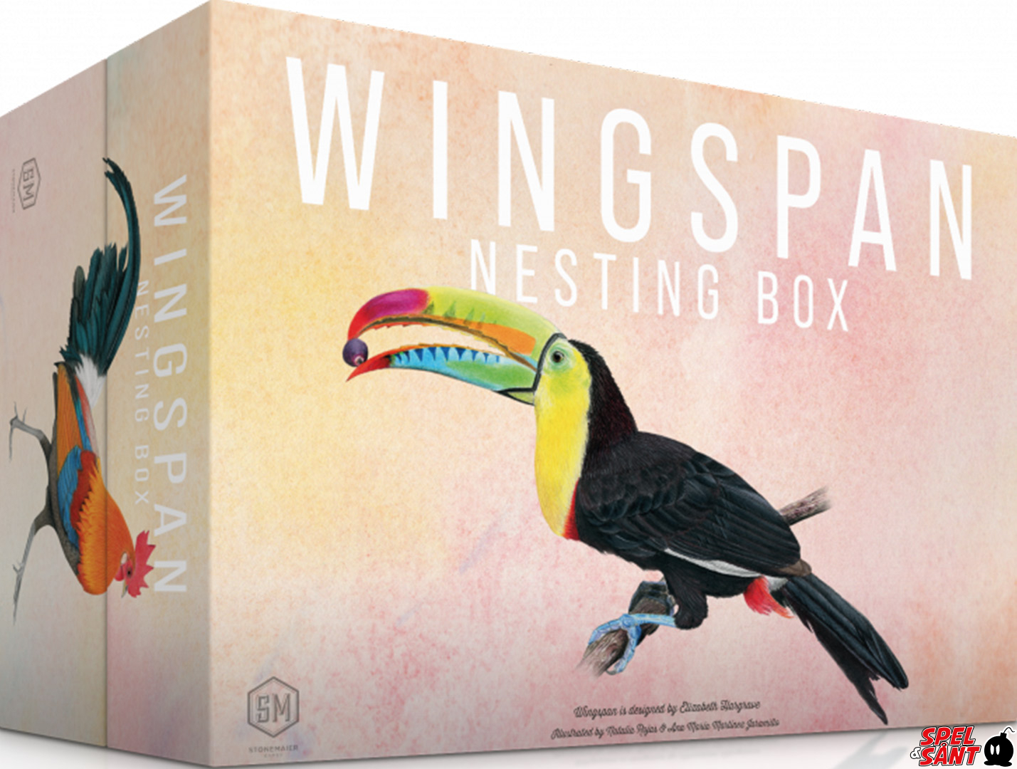 The Nesting Box is an organizer/storage box for all Wingspan content and cards (sleeved or unsleeved). This modular box is designed for all past, present, and future content. It does not include any gameplay content, and it is prepackaged for shipping, so no other items can be added to an order containing a single Nesting Box.