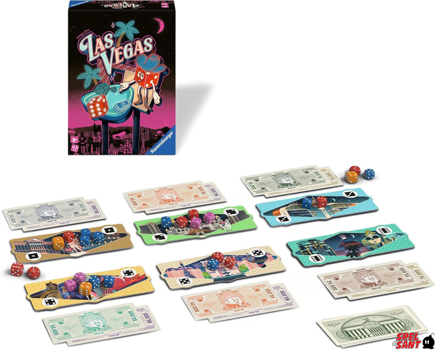 This game contains 40 dice, 6 casinos, 48 tickets and 1 First Player chip. Playing time approx. 30 minutes. For 2 to 6 players, aged 8 and over.