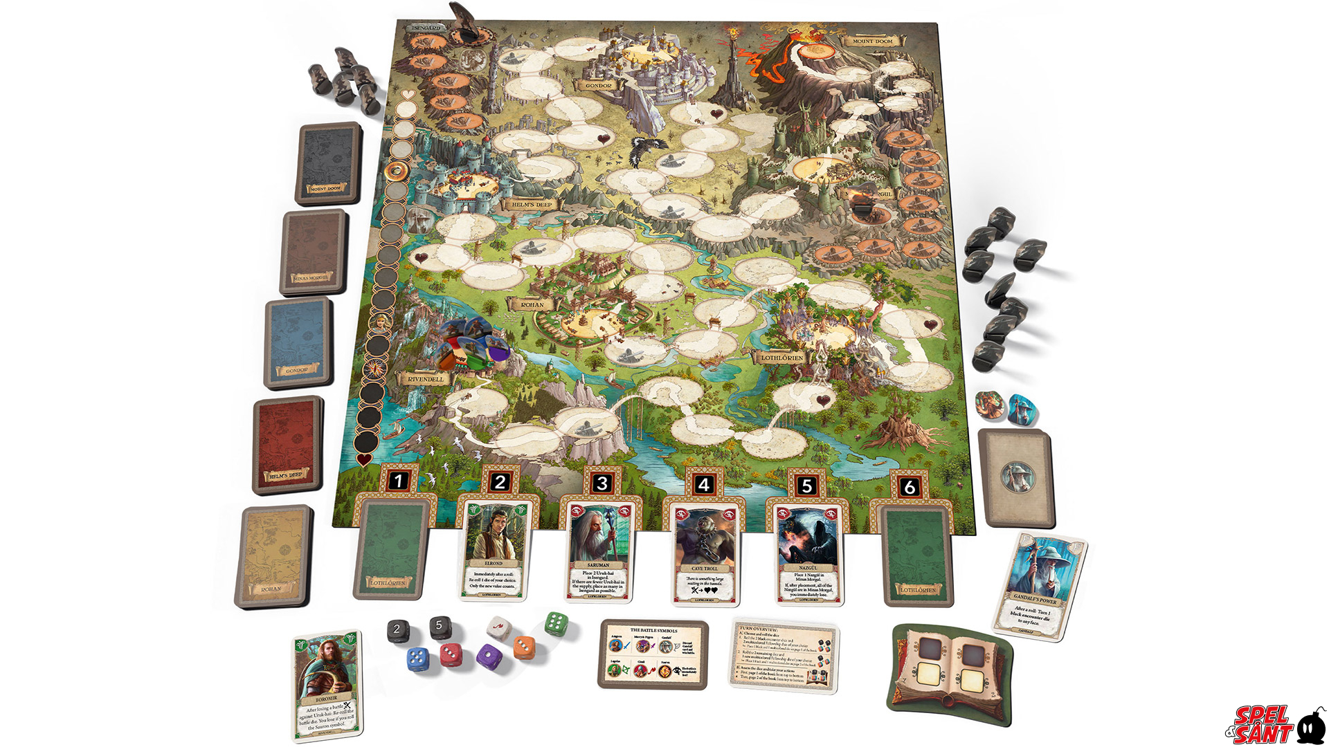 The movement of the characters is controlled by a special dice mechanism. Colored dice determine which figure can be moved. Your dice value determines the number of spaces a figure can travel. By choosing the dice before and after the roll, players are faced with decisions that are seemingly uncomplicated, but nevertheless significant for the outcome of the game. Black dice, which always must be rolled, trigger threats or cause encounters with enemies or friends. The encounter cards ensure the continuous, ever-growing threat to completing the quest.