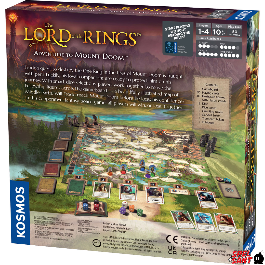In The Lord of the Rings: Adventure to Mount Doom, players follow the story of Frodo's perilous journey to destroy the One Ring in the fires of Mount Doom. He is accompanied by his familiar fellowship, who are charged with protecting him from the dangers he will face along the way. The players control the fortunes of this company together by moving the individual figures across the game board on a journey through many well-known places from the beloved Lord of the Rings novels. It is important to beware of the Nazgul while at the same time making sure that Frodo does not lose his confidence and freeze in despair. When Frodo reaches Mount Doom, the players have all won together.