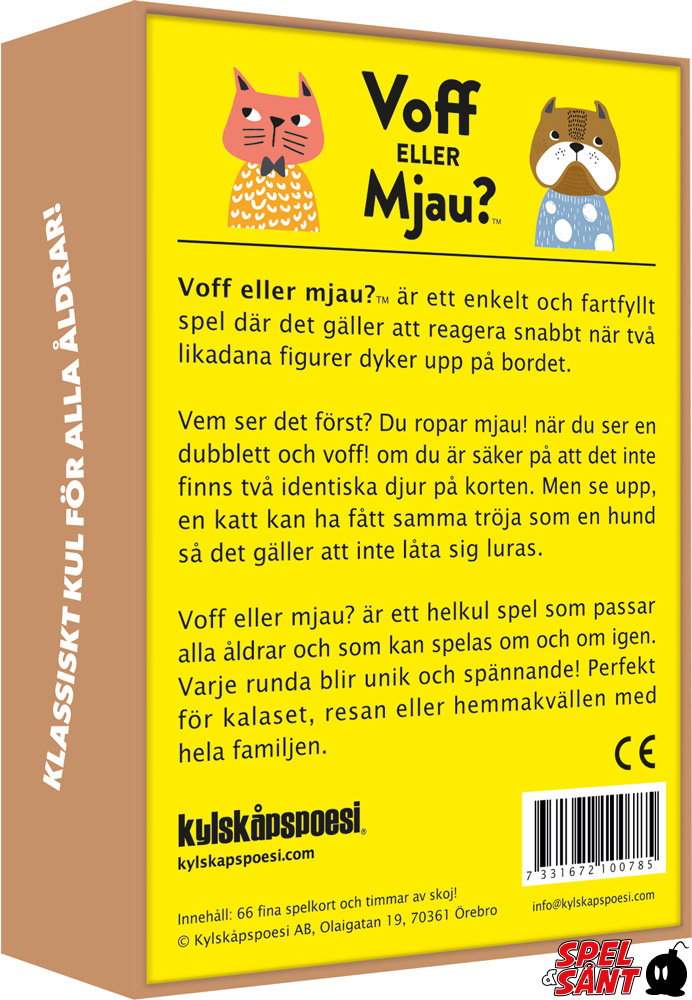 Voff eller mjau? är ett helkul spel som passar alla åldrar och som kan spelas om och om igen. Varje runda blir unik och spännande! Perfekt för kalaset, resan eller hemmakvällen med hela familjen.