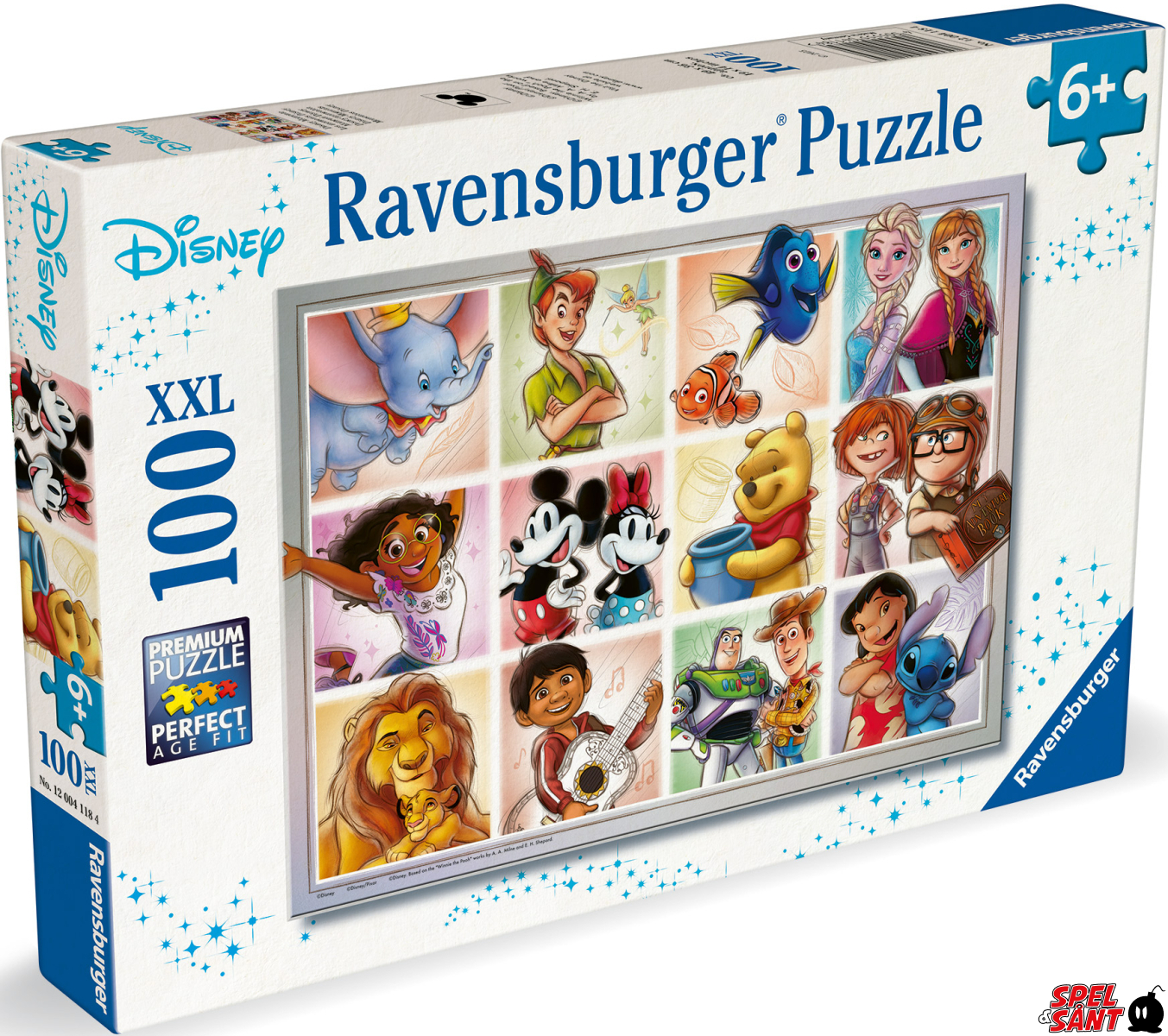 Sätt ihop detta färgglada och glada 100-bitarsformat med ikoniska karaktärer från Disney, vad är inte att älska? Följ med Dumbo, Peter Pan, Nemo & Dory, Elsa & Anna (Frozen), Mirabel (Encanto), Musse Pigg & Mimmi Pigg, Nalle Puh, Carl & Ellie (Upp), Mufasa och Simba (Lejonkungen), Miguel Rivera (Coco), Buzz & Woody (Toy Story) när du fördjupar dig i Disneys värld! Detta är ett måste för alla Disney-fans.