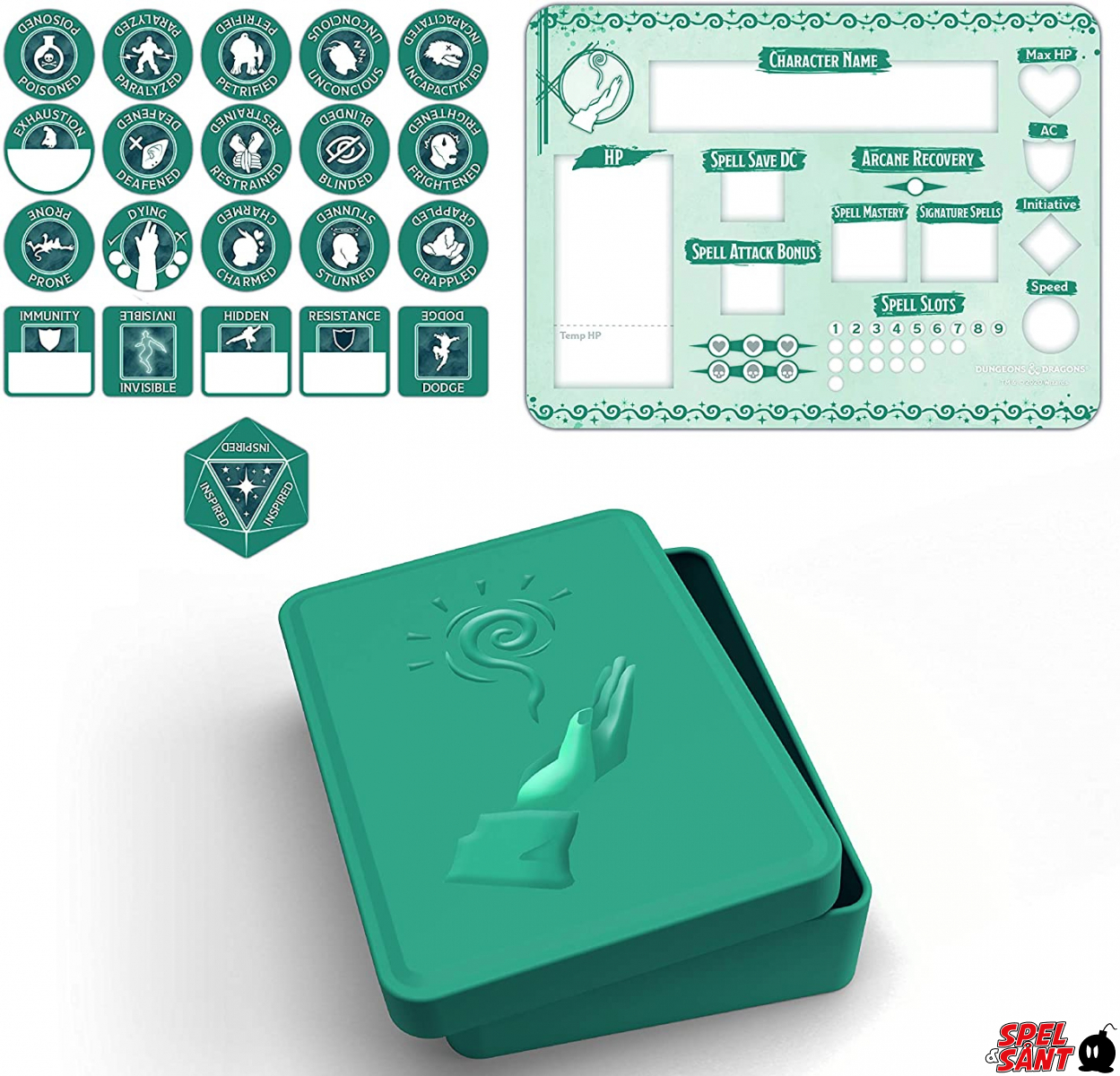 This Wizard token set is designed to allow you to easily and quickly track your character's status effects. If your character is frightened, paralyzed or unconscious, your allies will be able to see at a glance that you are in need of help. Because all of our full-colour tokens are made of durable perspex they are wet-erasable, so you can write additional information straight onto them. The combat tile provides a place for you to keep a running total of constantly changing statistics like character health and resources, all without dirtying your character sheet with eraser marks. Presented in a unique class tin, with space to add your character's name. Set Contains: 1 Wizard Combat Tile 25 Wizard Tokens