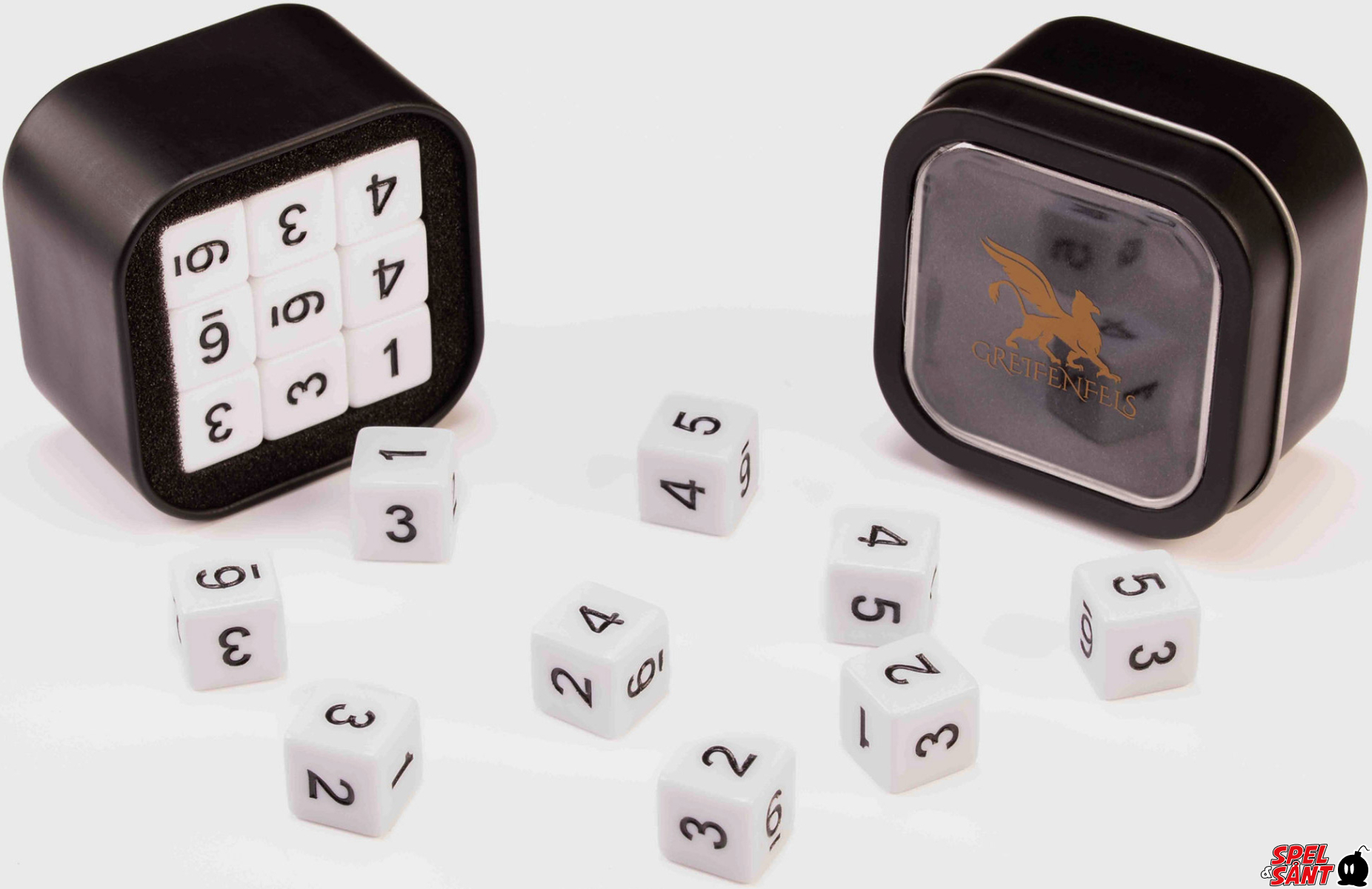 The Greifenfels D6 Series sets contain 18 acrylic 16mm 6 sided dice with numbered sides.
