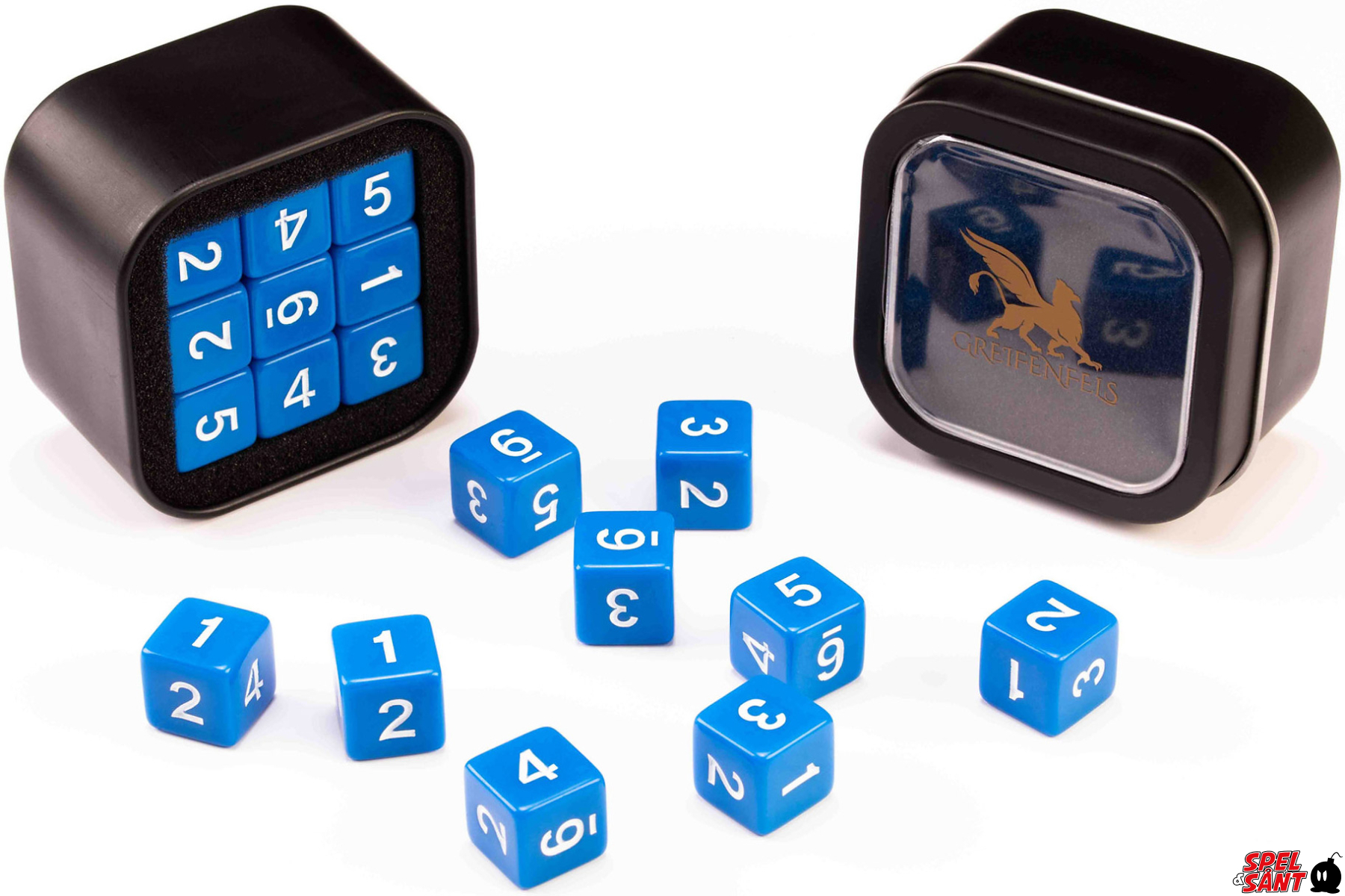 The Greifenfels D6 Series sets contain 18 acrylic 16mm 6 sided dice with numbered sides.