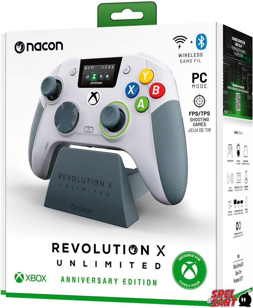 The REVOLUTION X UNLIMITED wireless controller by NACON, officially licensed for Xbox, is compatible with Xbox One, Xbox Series S, Xbox Series X, Windows PC, and Android.